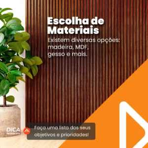 Dentre as opções disponíveis, você pode escolher entre madeira, MDF, gesso, cerâmica e outros materiais. Cada um tem suas características, vantagens e desvantagens. Dica: faça uma lista dos seus objetivos e prioridades para a escolha dos materiais, considerando orçamento, estilo e durabilidade.